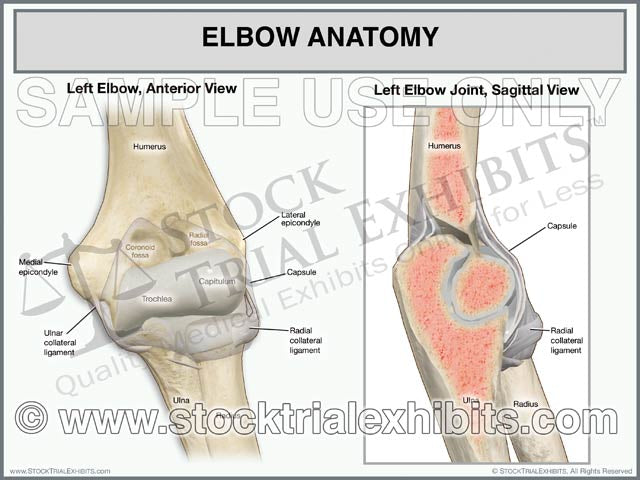 This trial exhibit depicts the normal anatomy of the left elbow in the anterior view, and close up sagittal view of the elbow joint.  This detailed medical exhibit includes anatomy labels of the elbow for easy identification of the anatomical structures.